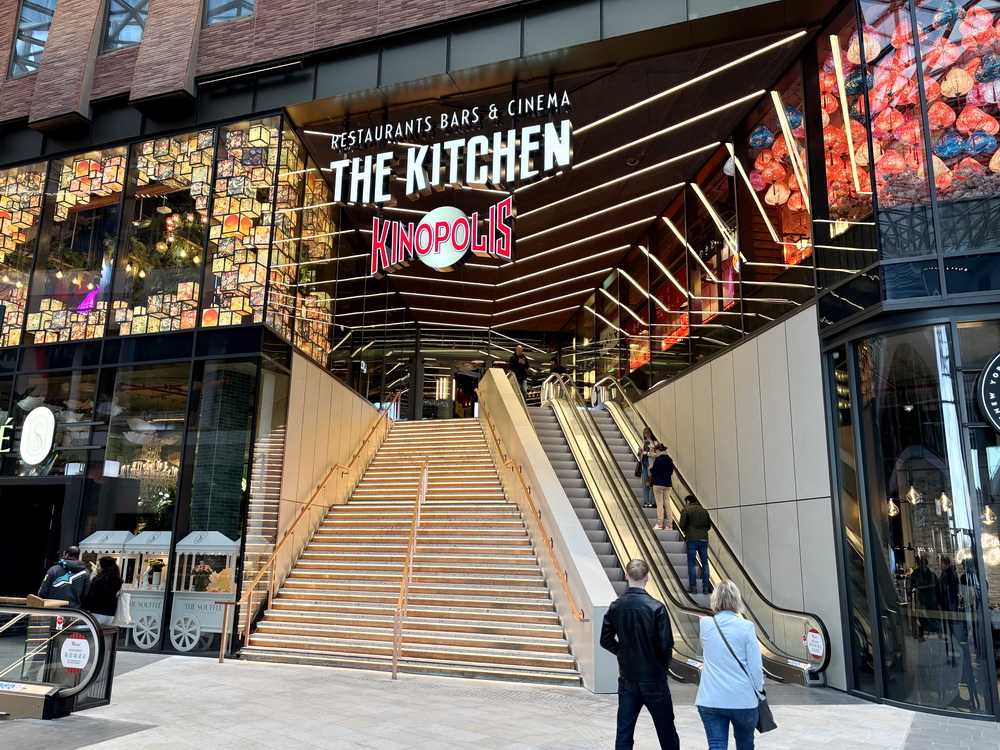 Eines der Highlights unserer Arbeiten war die Montage der The Kitchen / Kinopolis Schriftzüge über den Treppenaufgängen des Food Hubs. Hier war Präzisionsarbeit gefragt: Dank detaillierter Abstimmung mit den internationalen Bauleitern der unterschiedlichen Gewerke, musste das penible Logistik-Konzept strikt eingehalten werden. Die ½ Tonne schweren Anlagen wurden in Einzelteilen zum Montageort transportiert und sicher am Betonriegel verschraubt.