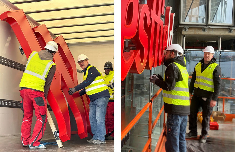 Die enge Taktung des Gesamtprojekts erforderte eine reibungslos abgestimmte Zusammenarbeit vieler Gewerke. Von der Koordination mit Projektleitung und Sicherheitsdienst bis hin zur millimetergenauen Positionierung der Leuchtbuchstaben auf an den Fassadenbauteilen im Vorwege installierten Edelstahlrahmen: Hier griff jedes Zahnrad ins andere.